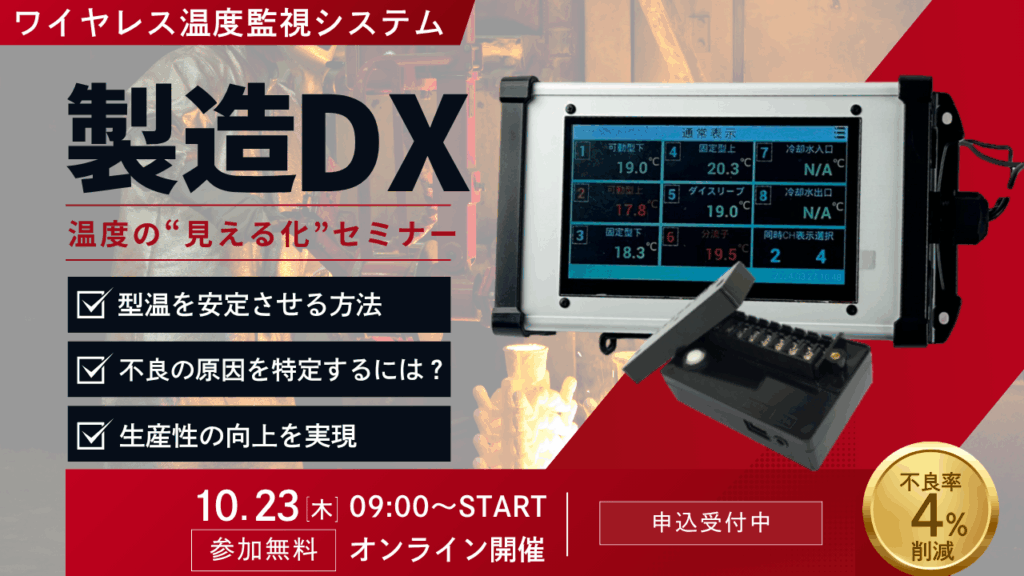 生産中に金型温度が条件範囲を外れないように監視する事で、製造品質の安定化、不良率の削減、不良原因の追及につながり、高い評価をいただいております。