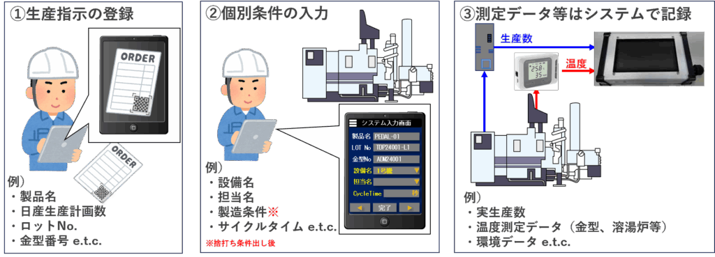 タブレットで生産データを入力し、設備やセンサーからは自動でデータを取得します。