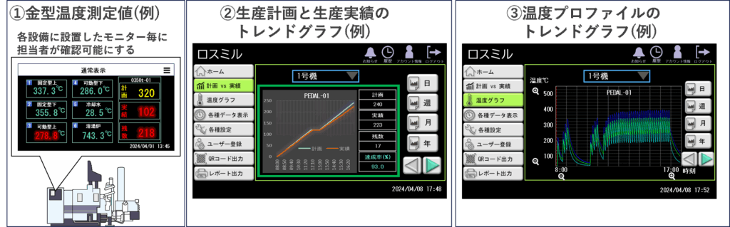 材料投入量と生産量の比較、良品/不良品比率、温度ばらつきなどをグラフ表示します。